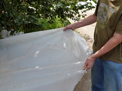 Kürzlich wurde die Membrane der anderen drei Bögen erst nach vierzehn Jahren erneuert. Das Schattentuch wurde deutlich schlechter und begann Lücken zu zeigen. Dies wird durch die UV-Strahlung verursacht, erklärt Lindeboom. Es war nicht notwendig, die Folie, die unter dem Schattentuch befestigt war, zu ersetzen. „Fühlen Sie mal wie zäh es ist“, sagt Jan de Wagt, der die alte Folie greift und daran zieht.