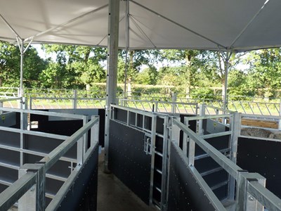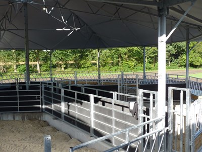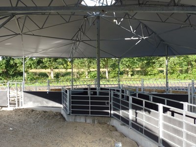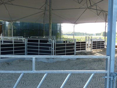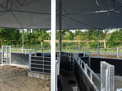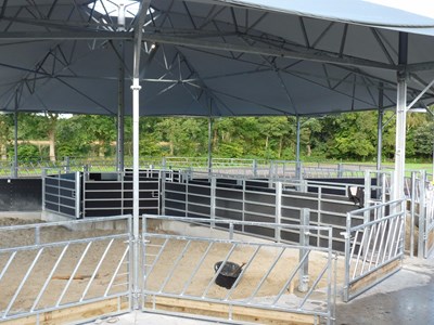 Es ist das auch das erste Roundhouse, das für Übergangsmanagement und für die Unterbringung von Kälbern bis zu 6 Monaten genutzt wird. Die Mitte des Roundhouses wird durch einen geräumigen zentralen Treibgang mit hohen und schweren Trenngittern durchschnitten. Dabei ist der Treibgang auf den vorhandenen Liegeboxenstall gerichtet und führt von dort zum zentralen Korral im Zentrum des Roundhouses. Vom zentralen Korral führen Tore zu allen Abteilen des Stalles. Die junge Kälber sind in einem Abteil des Roundhouse untergebracht. Damit die Kälber geschützt sind, hat er in dem, für Kälber vorgesehenen Abteil ein Stroh-Iglu aufgestellt. In einem anderen Abteil des Roundhouses sind einzelne hochträchtige Kühe untergebracht. Die Tiere haben viel Platz zum Liegen und Bewegen, können sich jedoch in dem runden Stall nicht einklemmen. Drei LED-Strahler an der Mittelsäule des Roundhouses sorgen für die nötige Beleuchtung. Die ersten Erfahrungen mit dem Stall stimmen das Ehepaar van der Gun sehr zufrieden.