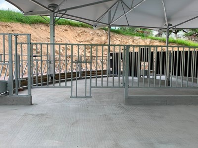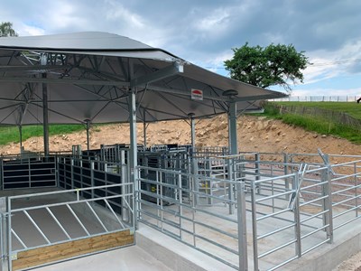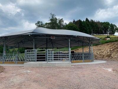 Im Rondell können die Tiere kurzfristig untergebracht werden, beispielsweise bei der Entmistung. Einzelne Tiere können ebenfalls aussortiert werden, zum Beispiel für eine Behandlung im Behandlungsstand, der ebenfalls mit dem Rondell verbunden ist. So kann das Tier unkompliziert und sicher in den Behandlungsstand mit integrierter Wiegeeinrichtung getrieben werden.