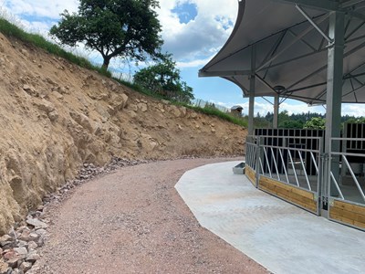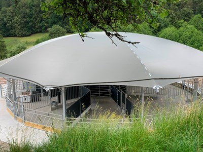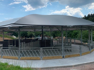 Vor einiger Zeit haben wir bei Familie Gerspacher ein neues Roundhouse 22 m errichtet. Dieser runde Stall hat eine Grundfläche von etwas über 400 m2 und einen Durchmesser von 22,8 m. Der Stall ist in sechs Abteile aufgeteilt, die wie Kuchenstücke angeordnet sind. Sowohl Anzahl als auch Größe der Abteile können variiert werden. In der Mitte befindet sich ein Rondell, das als Verbindung zwischen den einzelnen Abteilen dient.