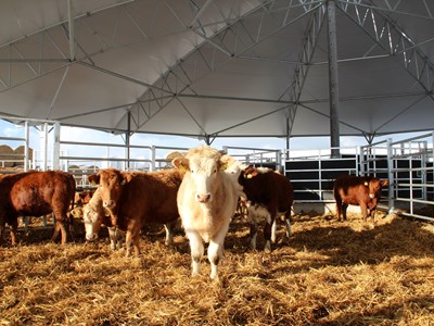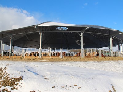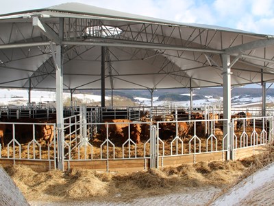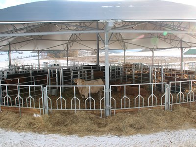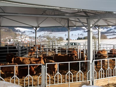 Für die Blonde d'Aquitaine Herde wurde in Werra-Meißner-Kreis der erste Roundhouse Stall in Hessen errichtet. Die Tiere im Betrieb sind von April bis November auf der Weide und verbringen den Winter im Stall. Die Familie hat sich für das Roundhouse-Stallkonzept entschieden da die Tiere arbeitswirtschaftlich günstig von nur einer Person betreut werden können.